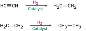 Alkynes are reduced to alkanes by addition of H2 over a metal catalyst. The reaction occurs in two steps through an alkene intermediate.